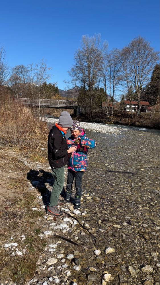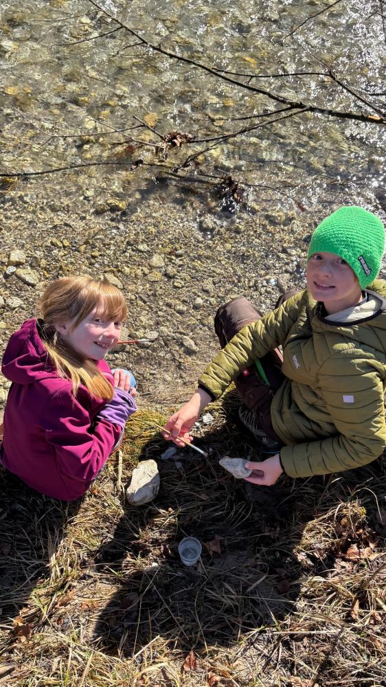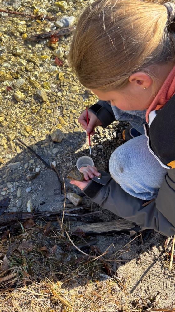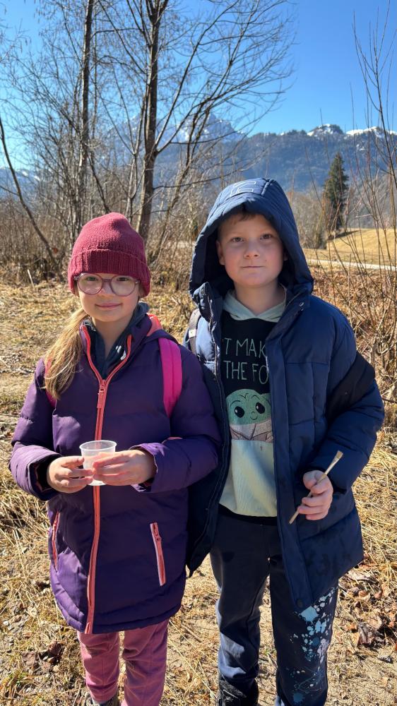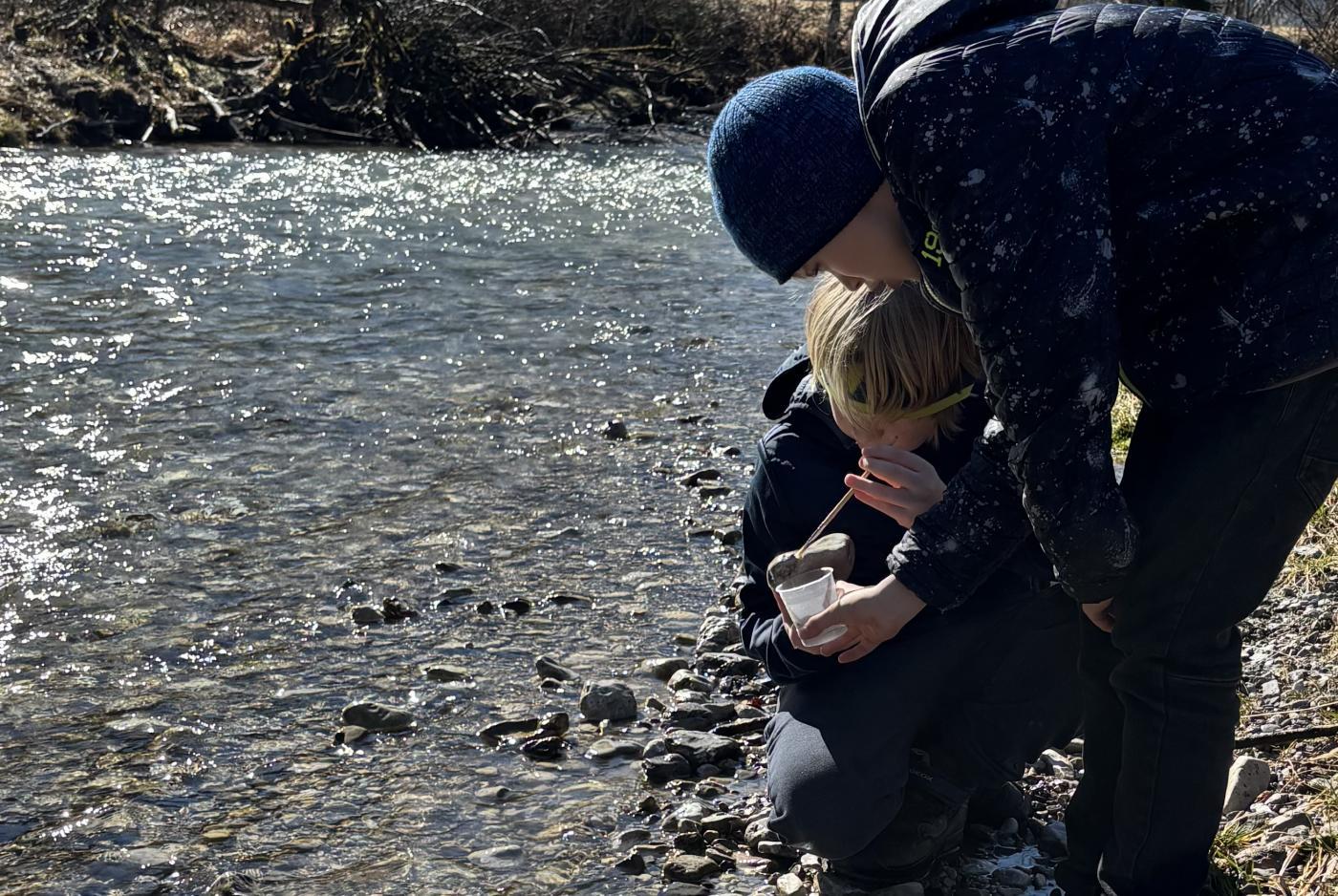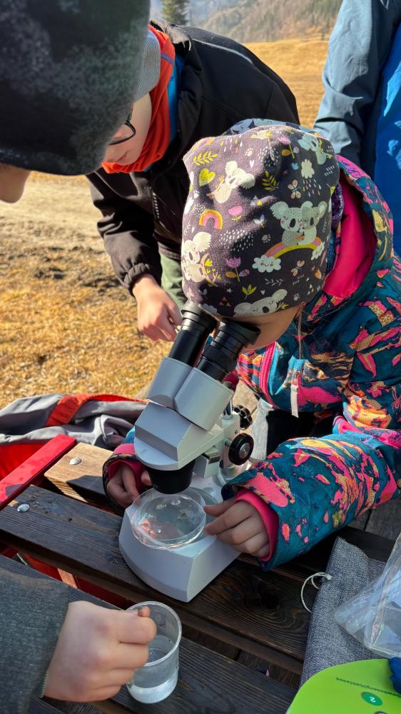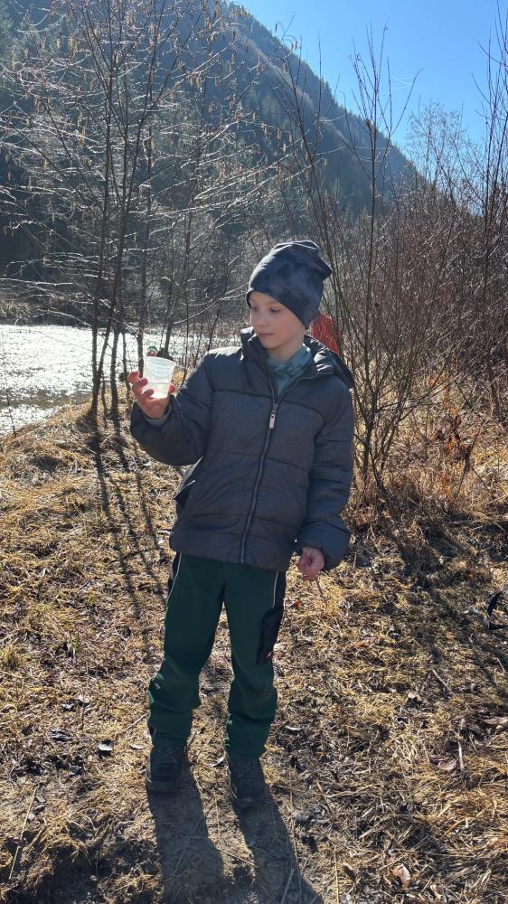 Am dritten Tag ging es schließlich raus in die Natur. Wie Wasseramseln begaben sich die Schüler:innen auf die Suche nach den kleinen Einwohnern des Kohlenbaches. Voller Begeisterung drehten sie einen Stein nach dem anderen um und pinselten die kleinen Krabbler vorsichtig in einen Becher. Am Bachrand wartete Christoph mit einem Mikroskop, wo die Eintagsfliegenlarve, die Köcherfliegenlarve oder der Strudelwurm genauer betrachtet werden konnten. Es ist erstaunlich, wie belebt die „Kohle“ ist und die dort entdeckten Lebewesen bestätigten dem kleinen Bach eine hervorragende Wasserqualität!