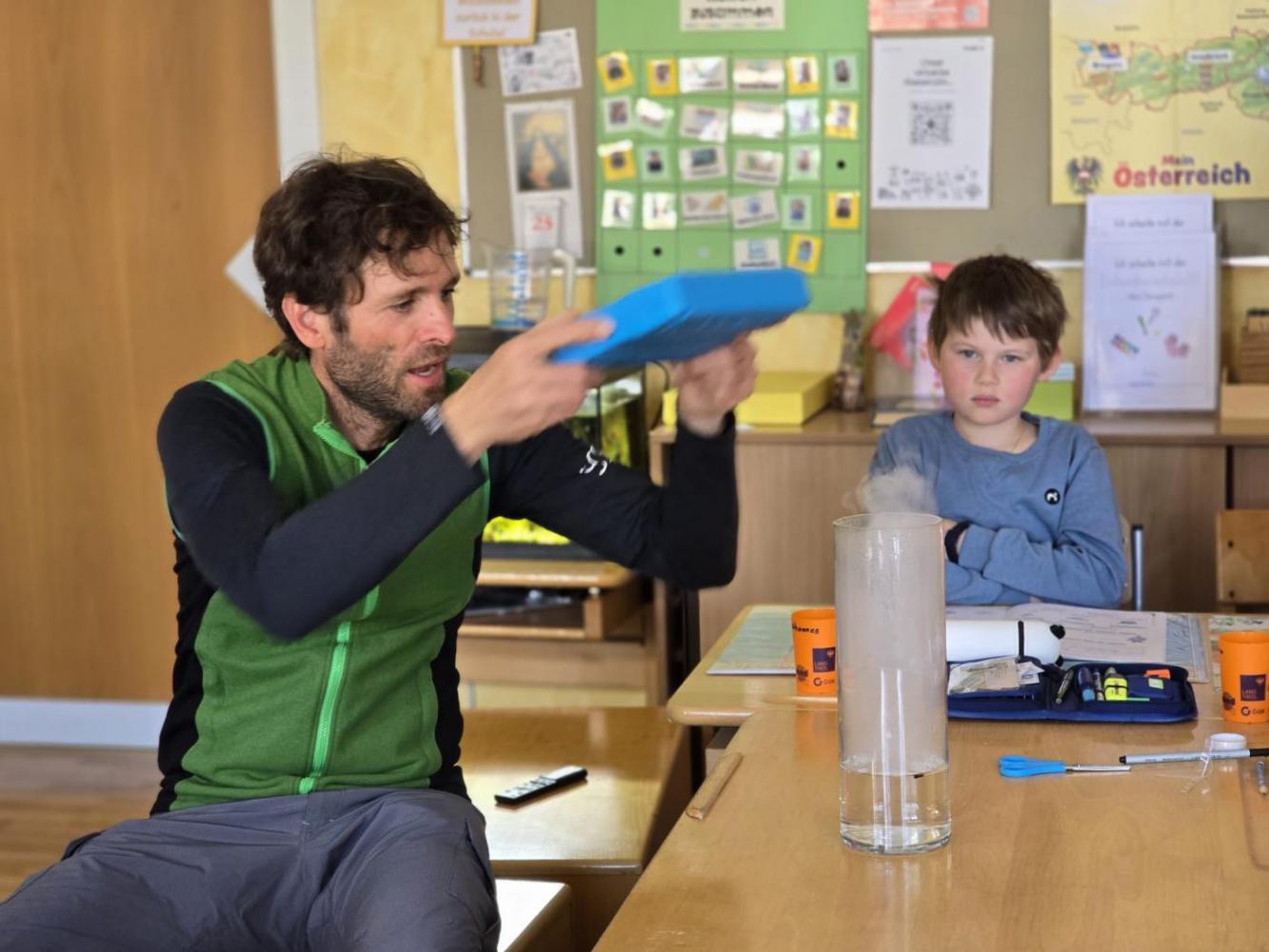 Zum Nationalpark rund um Österreichs höchsten Berg gehören natürlich auch die Gletscher, das über tausende von Jahren gefrorene Wasser, das für seine Umgebung so prägend ist. Den Kindern wurde bewusst, dass Wasser eben nicht nur in flüssiger Form vorkommt, lernten auf diese Weise die Aggregatzustände kennen und erlebten in einem Experiment, wie in der Klasse eine kleine Wolke entstand. Gemeinsam tauchten sie immer tiefer in die Wasserthematik ein und stellten mithilfe des Wasserkreislaufes fest, dass wir dasselbe Wasser trinken, mit dem sich bereits Dinosaurier gewaschen haben. Sie begriffen anhand eines selbst gebauten Bodenfilters, wie Grundwasser so sauber wird, dass man es überhaupt trinken kann und wie gering trotzdem der Anteil des Trinkwassers auf der ganzen Welt ist.